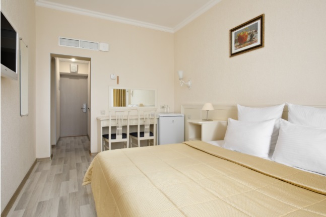 В номере: полутораспальная кровать, тумбы прикроватные, стол, стулья, телевизор, холодильник, сейф, электрический чайник