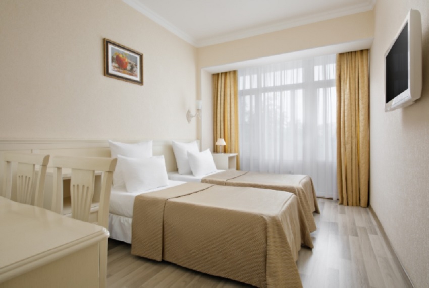 В номере: две односпальные кровати, тумбы прикроватные, стол, стулья, телевизор, холодильник, сейф, электрический чайник, набор посуды, телефон